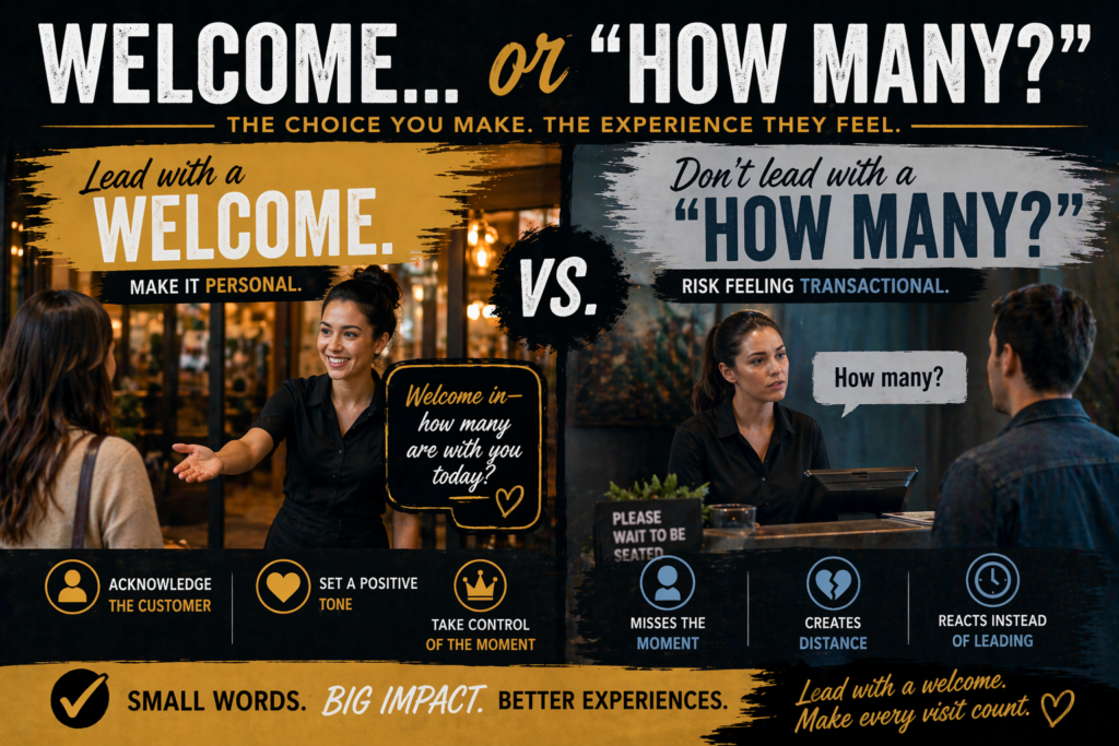 It doesn’t require a script or a major change in process. It’s a subtle adjustment in how the interaction begins. “Welcome in—how many today?” or “Good evening, welcome—how many are with you?” adds no real time, but it dramatically changes the tone. The customer is acknowledged first, then the need is addressed.